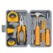 24-in-1 daudzfunkcionāls mājas remonta rokas instrumentu komplekts ar knaibles, uzgriežņu atslēgu, āmuru, mērlenti, skrūvgriezi un instrumentu kasti dzeltenā aparatūrā