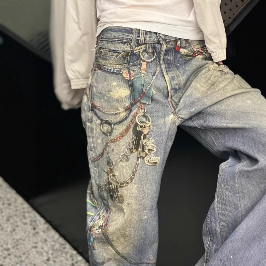 boy Style Wahed Vintage Printed Jean For Men Spring Autumn Straight Looe European And American High Street Vibe Long