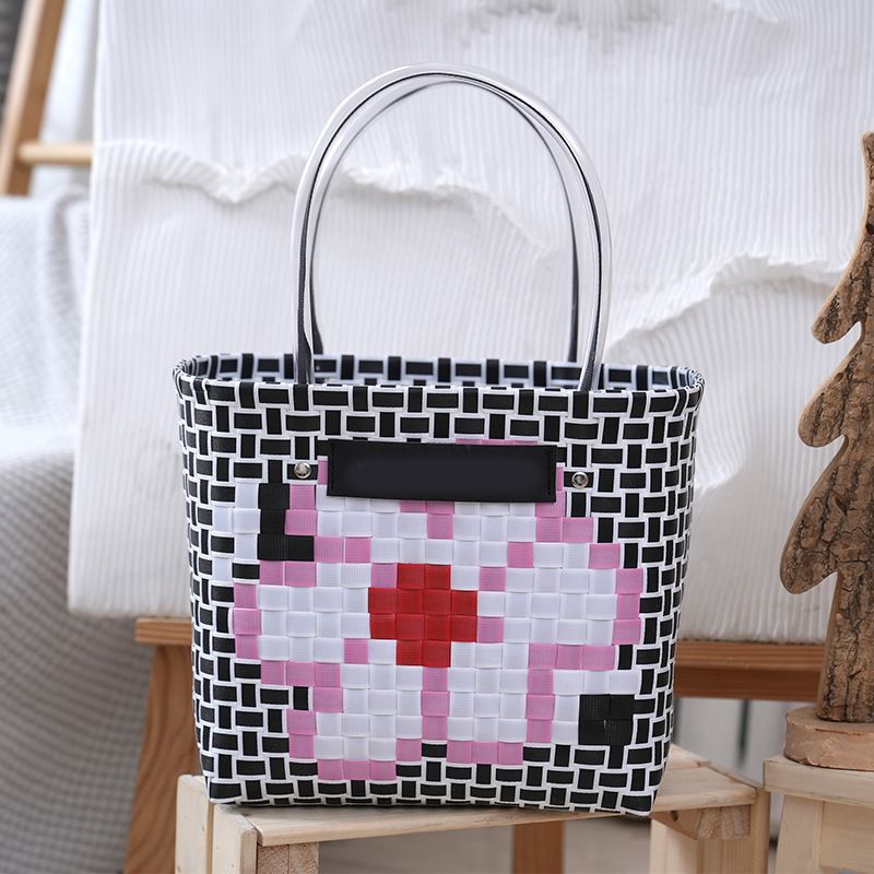 Color Block Handwoven Basket Ins Style PVC Large Capacity Bucket Single Shoulder Handbag Beach Picnic Bag