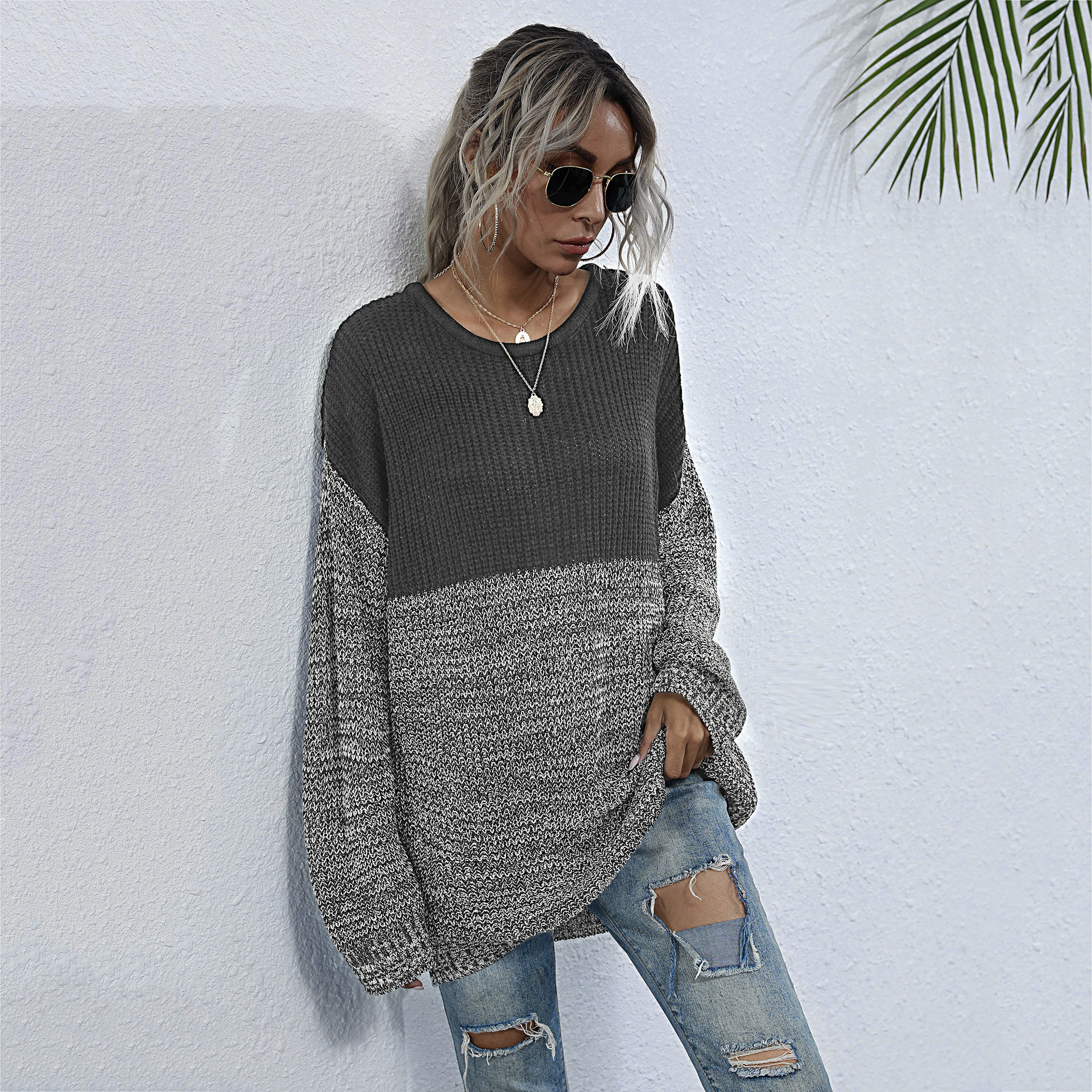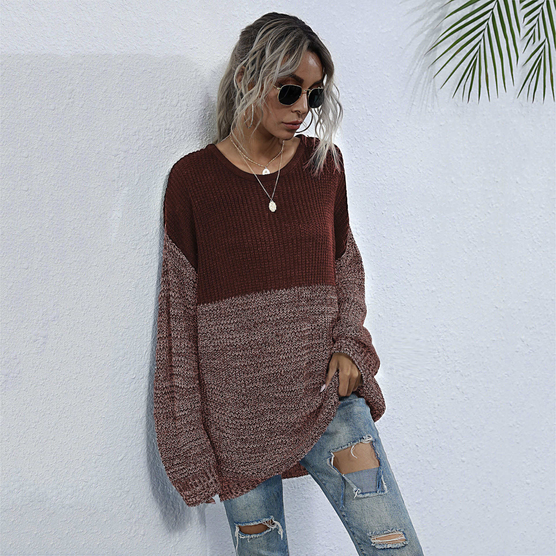 Contrast Color Mid-length Loose Round Neck Lazy Style Sweater Pullover