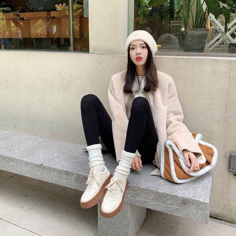 Cowhide round toe thick sole multifunctional lace-up casual white shoes for women
