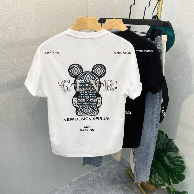 Bear print short sleeved t-shirt for men's summer loose fashion label couple outfit, pure cotton round neck T-shirt with a base shirt