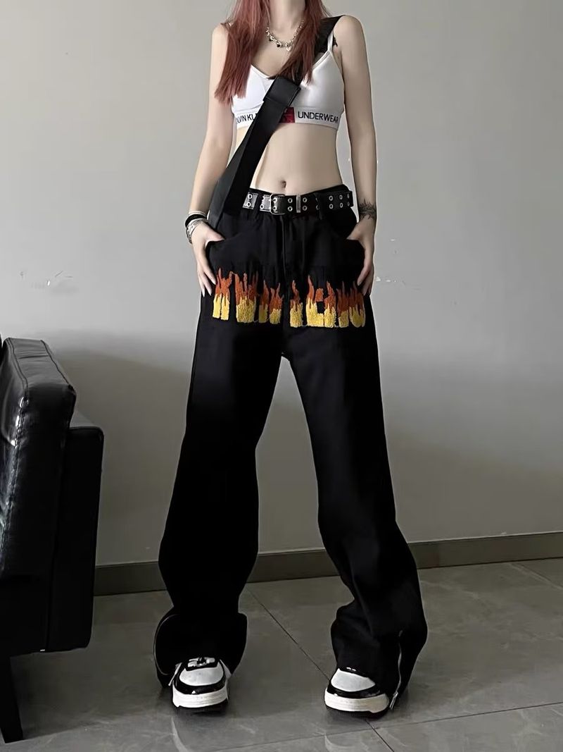 Trendy hip-hop street towels embroidered loose zipper straight leg long pants American ins street hip-hop jeans
