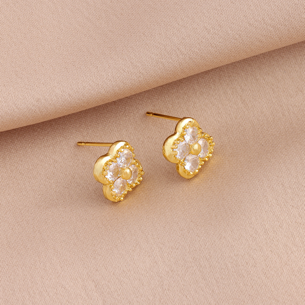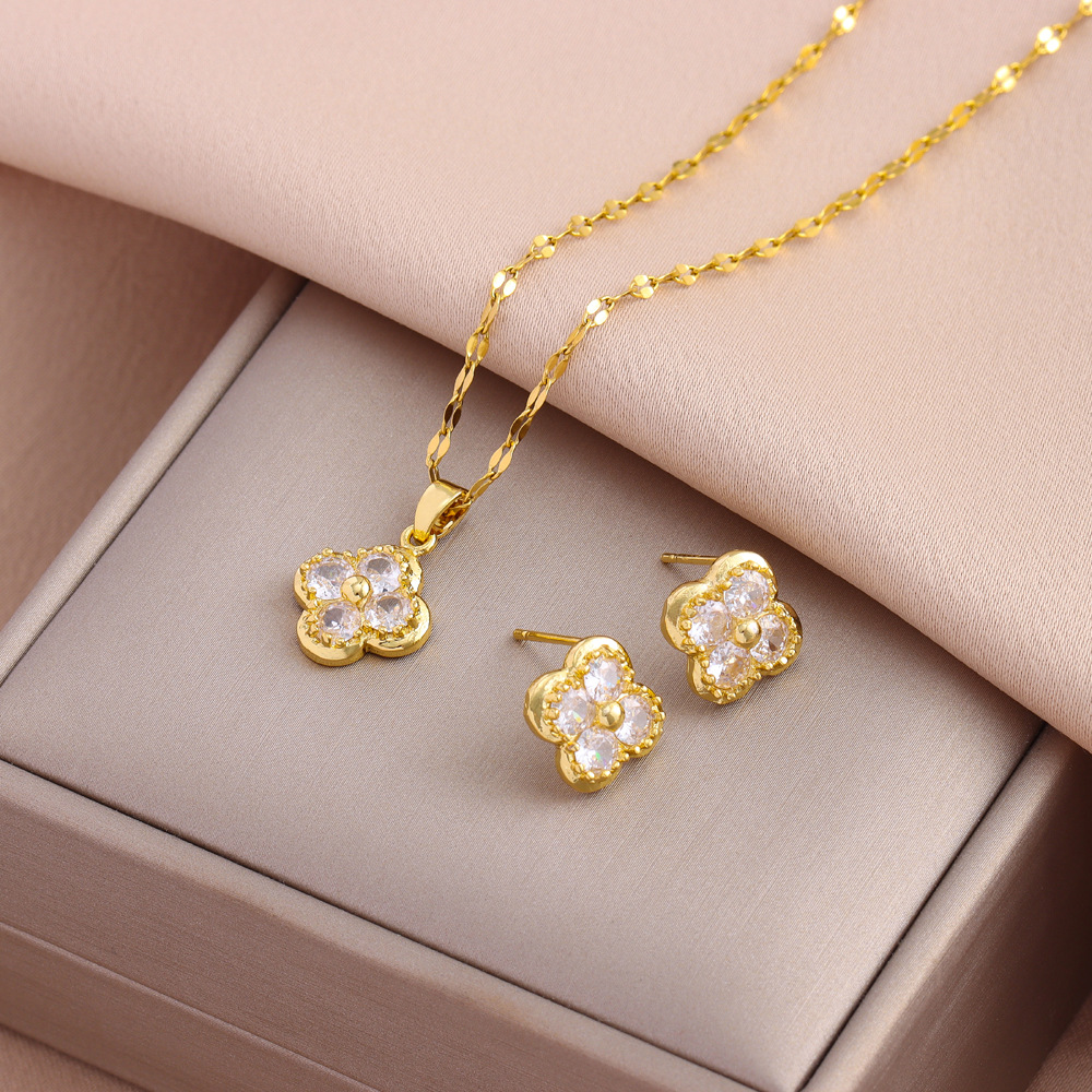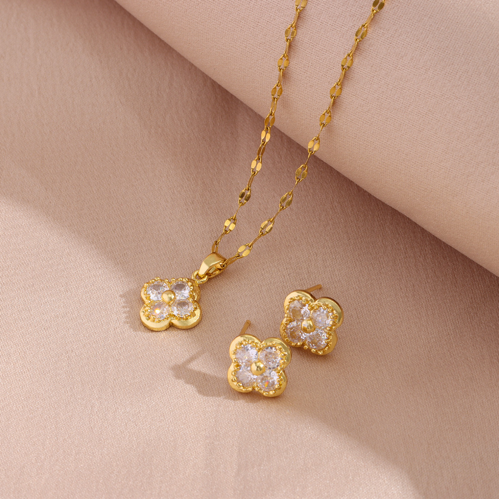 Jauns, temperamentīgs, viegls, grezns, mikroinkrustēts cirkona četrlapu āboliņa kaklarotas un auskaru komplekts