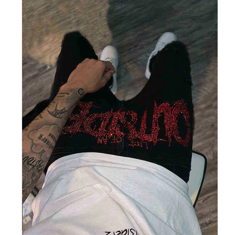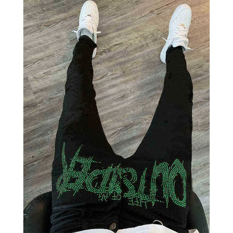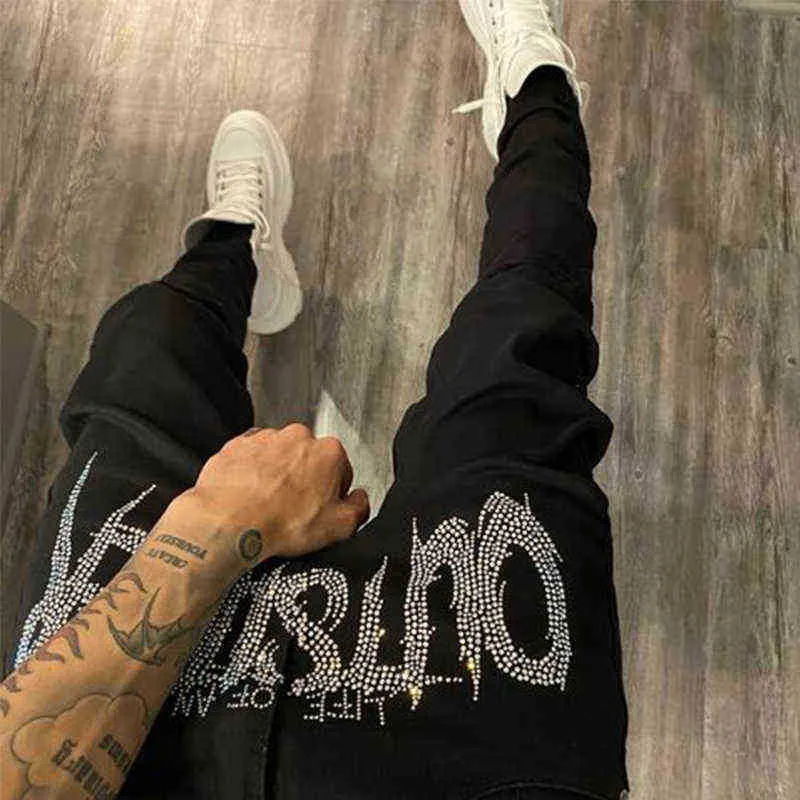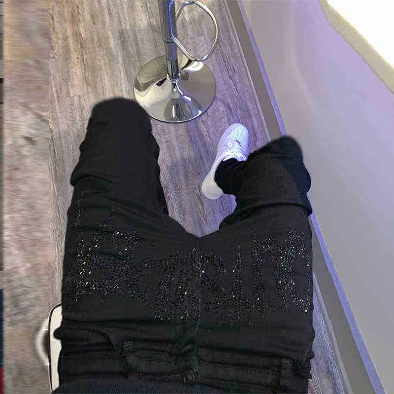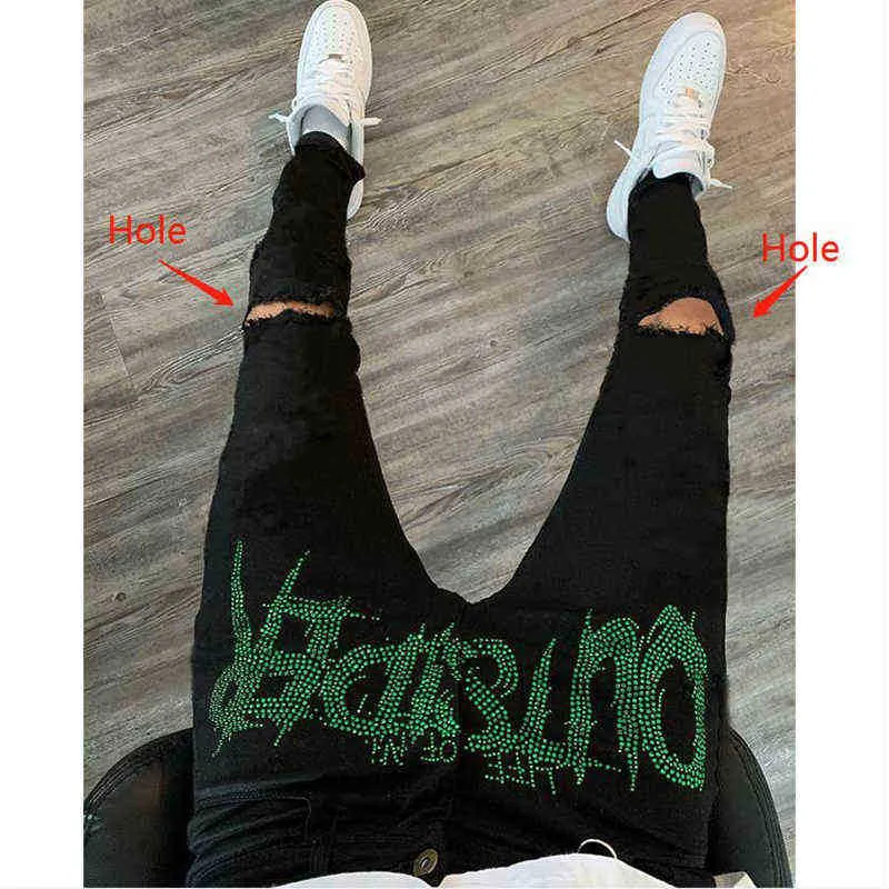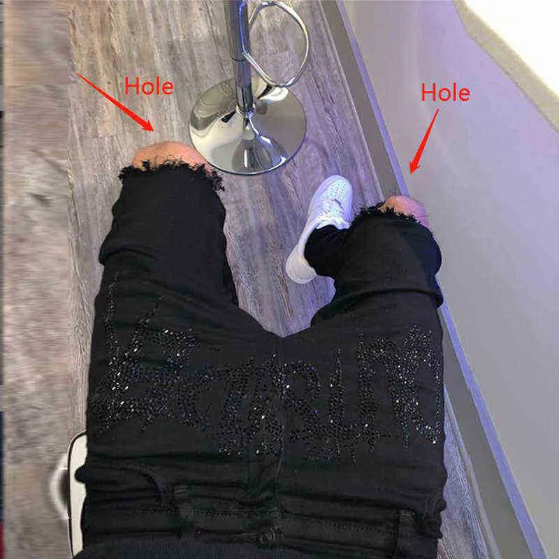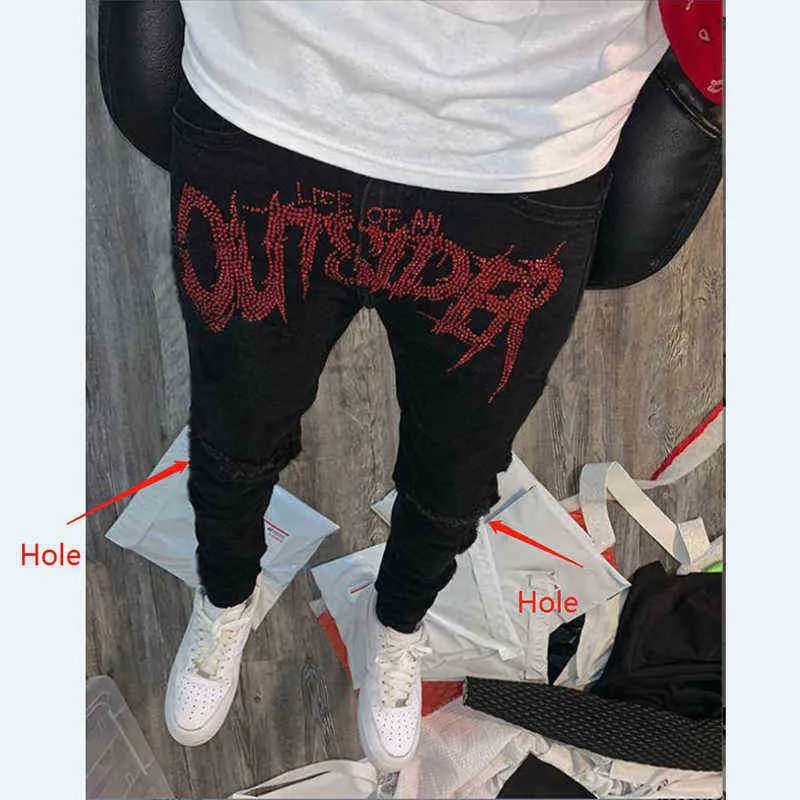 Jaunas vīriešu melnas džinsa bikses ar augstu jostasvietu, šauru dizainu, caurumu, karstas, urbtas, stieptas, mazas pēdas, mazgātas džinsa bikses.