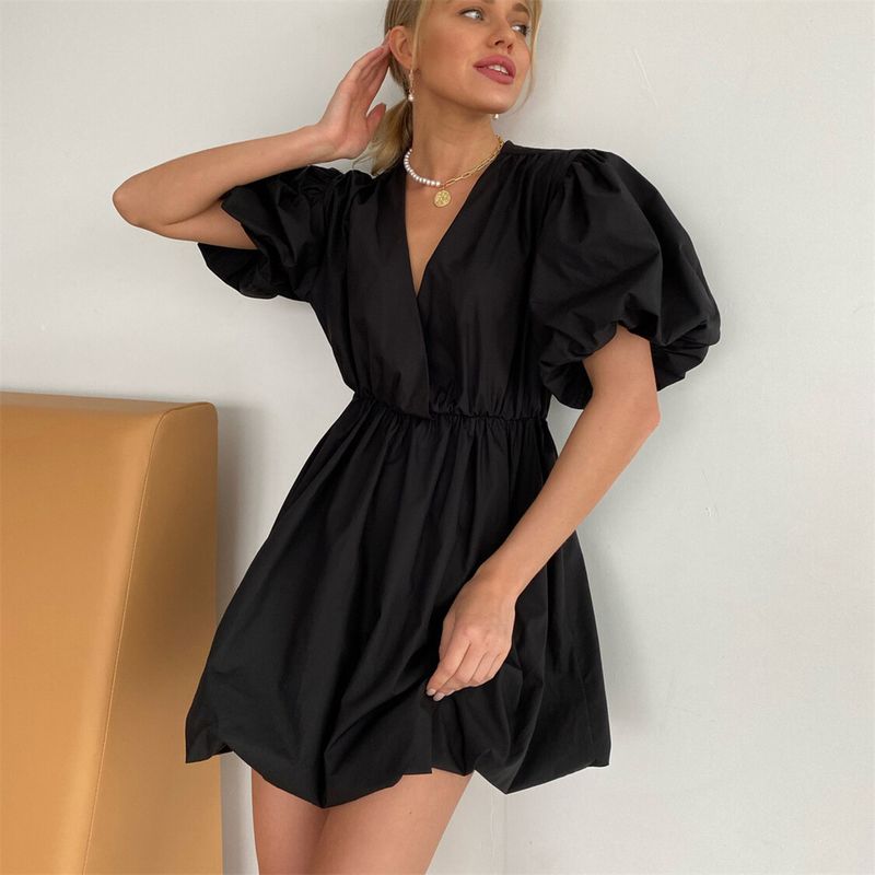 Short sleeved dress for women in summer 2023, new short skirt with a feminine feel, V-neck lantern sleeves, waist cinched princess skirt for women