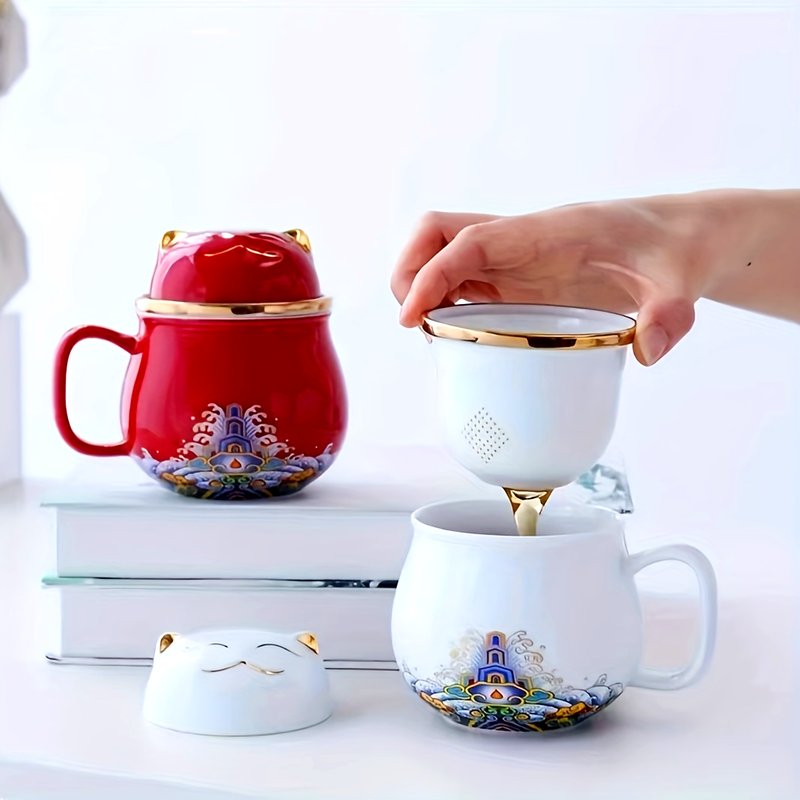 Set, Chinese Fortune Cat Tea Mug With Travel Bag, Ceramic Tea Cup With Infuser And Lid, Portable Drinkware