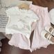 Vasaras jauns, salds princeses stila uzvalks ar bantīti, īsām piedurknēm, rozā rūtainām, uzliesmojošām, platām biksēm un volāniem, divdaļīgs uzvalks