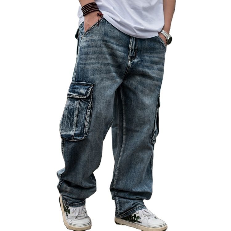 Washed Side Pockets Loose Fit Blue Straight Wide Leg Casual Denim Mens Baggy Cargo Jeans Pants For Men